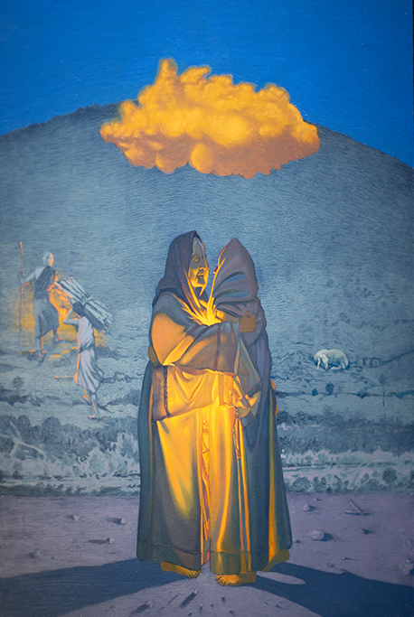 Kwestia swoistego filtrowania historii świętej przez pryzmat osobistej wizji została odwrócona przez Wojciecha Głogowskiego, który – jak podkreśla – w miejsce sprowadzania wielkiego tematu do osobistego motywu, stara się wręcz „wciągać” to, co mu najbliższe, w wielką historię. Właśnie dlatego scena Nawiedzenia na jego płótnie wygląda jakby rozgrywała się w innej rzeczywistości. Kolory są zgaszone, całość jakby zamglona. Pasmo górskie wypełniające ją miesza się z kłębowiskiem chmur, a umieszczone w nieokreślonej przestrzeni postaci na pierwszym planie zdają się jakby barwnymi cieniami. Ich fizjonomia przypomina lalki, co tylko wzmaga wrażenie odrealnienia. Zdaje się wręcz, że mamy tu do czynienia z malarskim przedstawieniem nie konkretnego wydarzenia, ale pewnego wyobrażenia o nim (wizji lub snu). Wyobrażenia nie cudzego, a naszego – świadczą o tym intensywnie wpatrujące się w widza piwne oczy Maryi.