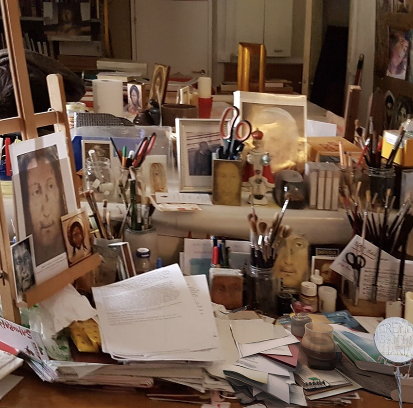 Była to filigranowa, lecz zmęczona fizycznością lat, postać Blandiny Paschalis Schlömer, która delikatnie omiotła czułym i badawczym spojrzeniem siostrę Monikę i mnie. Kończyła z kimś rozmowę i po chwili była już zwrócona w naszą stronę. Wiele przed tym spotkaniem czytałem o badaniach Siostry. Samo spotkanie było teraz tak realnym. Po kilku słowach Siostra zaprosiła nas do siebie, do pustelni, nieopodal klasztoru. Miałem wiele szczęścia, ponieważ Siostra zaprosiła mnie do swojej pracowni, czego, jak się potem dowiedziałem, niezwykła była robić. Od lat w niej, w ciszy, pisze ikony. Dotknąłem tego pięknego warsztatu. Do pomieszczenia prowadziły żaluzjowe drzwi otwarte na taras z widokiem na sanktuarium. W środku wielki stół roboczy definiujący pomieszczenie. Na nim przybory, kolorowe sypkie pigmenty w słoiczkach, ceramiczny moździerz, pędzelki w glinianym garnku, próbniki kolorów i szkice ikonowych przedstawień. Kilka książek, jakby do użytku w tej chwili zostawionych, otwartych, zaznaczonych ołówkiem lub papierową zakładką, by nie zgubić myśli. Notatniki z zapiskami. Na ścianach reprodukcje Volto Santo, Całunu Turyńskiego i innych saudarionów oraz reprodukcje ikon i wczesnochrześcijańskich przedstawień Jezusa. Wydrukowane na folii, ponakładane na siebie jak kalki, szkice, szablony ikon, dwie zagruntowane deski ikon z podmalówkami przykryte warstwą kalek rysunkowych. Praca w procesie. Nie ośmieliłem się podglądać. Regały z książkami, a na nich zdjęcia z papieżem Benedyktem XVI i zdjęcie ojca Pfeiffera. Na komodzie ołtarzyk z ikoną Mandylionu autorstwa Siostry z nadpalonymi świeczkami i naprzemiennie poukładanymi przedmiotami codziennego użytku. Miejsce żywe – pomyślałem.